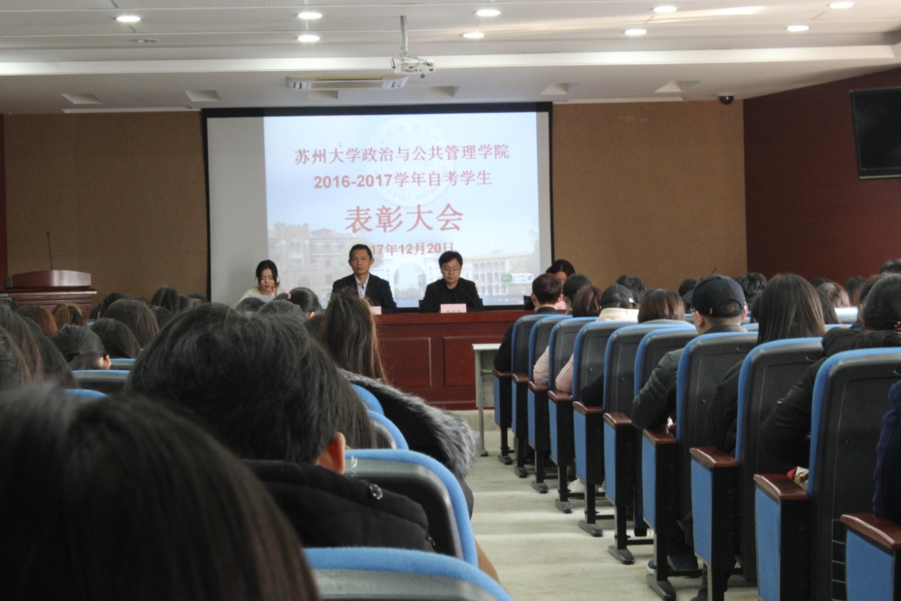 2017年12月20日下午,政治与公共管理学院2016-2017学年自考助学学生奖学金表彰大会在独墅湖校区一期606楼403报告厅隆重举行。学院院长陈进华、副院长吉文灿、院长助理邵健以及各班班主任、获奖学生和17级独墅湖校区新生代表参加了会议。大会由院长助理邵健主持。